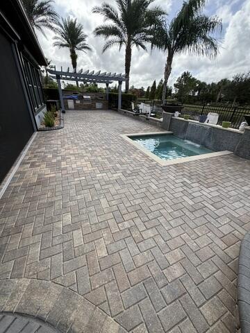 Fresh sand and a fresh seal! Matte finish on this pool deck and brand new sand. These pavers will be protected for 2-3 years before they need a maintenance coat.